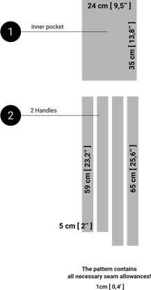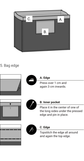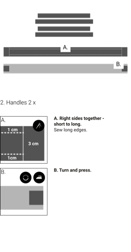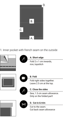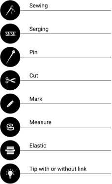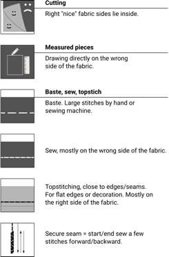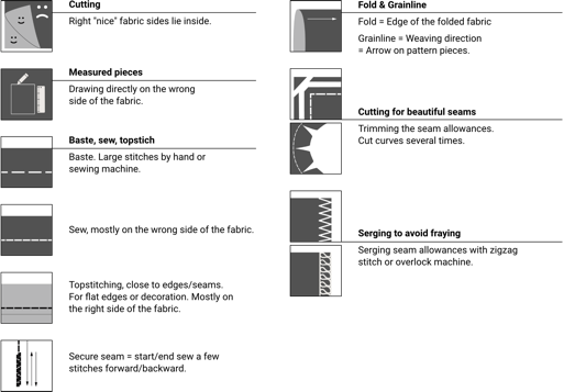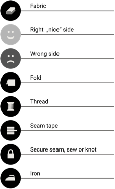 Sewing machine, iron, ironing cloth/board, tailor‘s scissors, tape measure, ruler, tailor‘s chalk, marking pens, pencil, pins, sewing needles or clips.