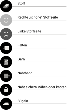 Nähmaschine, Bügeleisen, Bügeltuch/-brett, Schneiderschere, Maßband, Lineal, Schneiderkreide, Markierstifte, Bleistift,